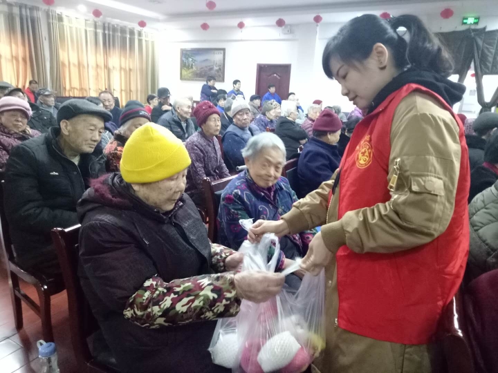 随着健身操的音乐的结束,市残联领导和志愿者们带着大箱、小盒的礼物走进七楼活动大厅。首先,市残联领导罗姿上台致辞,她在为老人们送上祝福的同时也不忘阐述着“雷锋精神”。其他的志愿者们也忙着为老人们分发水果。苹果、香梨、香蕉、橙子,他们用心地搭配着,然后一一装在每个袋子里,再分发给每位老人。他们一边为老人送上水果,一边和老人聊家常,像是和家人、亲友间的交谈,特别温馨。最后,市残联的领导和志愿者们合唱了一曲《爱的奉献》来结束了这次的慰问活动。